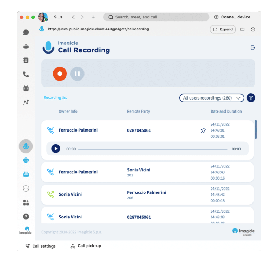 Imagicle Call Recording, 100% Cloud and compliant with security regulations (GDPR, HIPAA, PCI-DSS, MiFID II, and more), allows easy configuration and management directly on Control Hub in any Webex Calling region and seamless access to recordings from the Webex App. Supporting internal and external calls in Always On, On Demand, and Live Keep modes with Pause/Resume.
