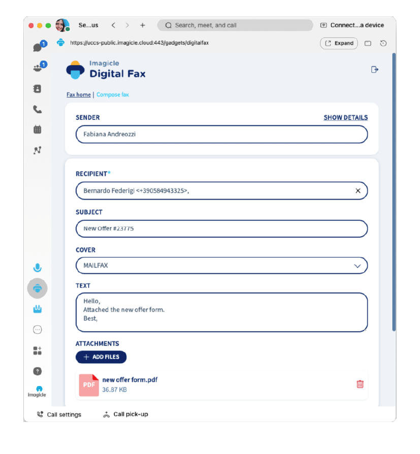 Imagicle Digital Fax, 100% software-based, is the ONLY virtual fax server available inside the Webex Control Hub and fully integrated with Webex Calling Multi-Tenant and Dedicated Instance. The direct connection with Control Hub allows to send and receive faxes regardless of your PSTN (including Cisco PSTN) with a quick configuration, and easy access to faxes from the Webex App.